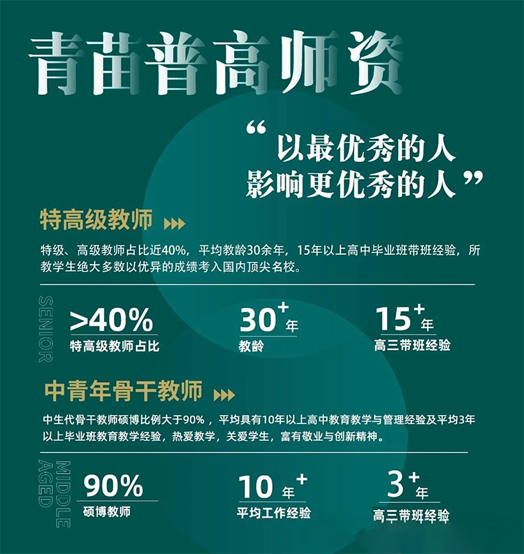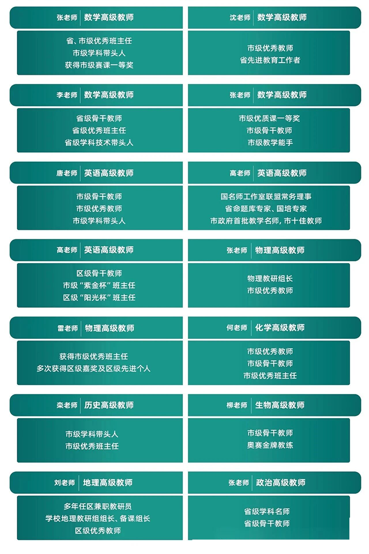 特级、高级教师占比近40%,平均教龄30余年,15年以上高中毕业班带班经验,所教学生绝大多数以优异的成绩考入国内顶尖名校。